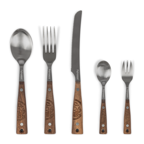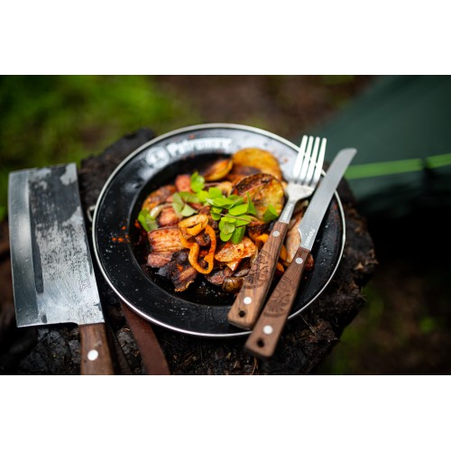 Valrieksta koka rokturi piešķir komplektam unikālu raksturu un lieliski iederas āra virtuvē. Ar cilpiņas palīdzību vari to ērti piekārt pie mugursomas vai kempera.