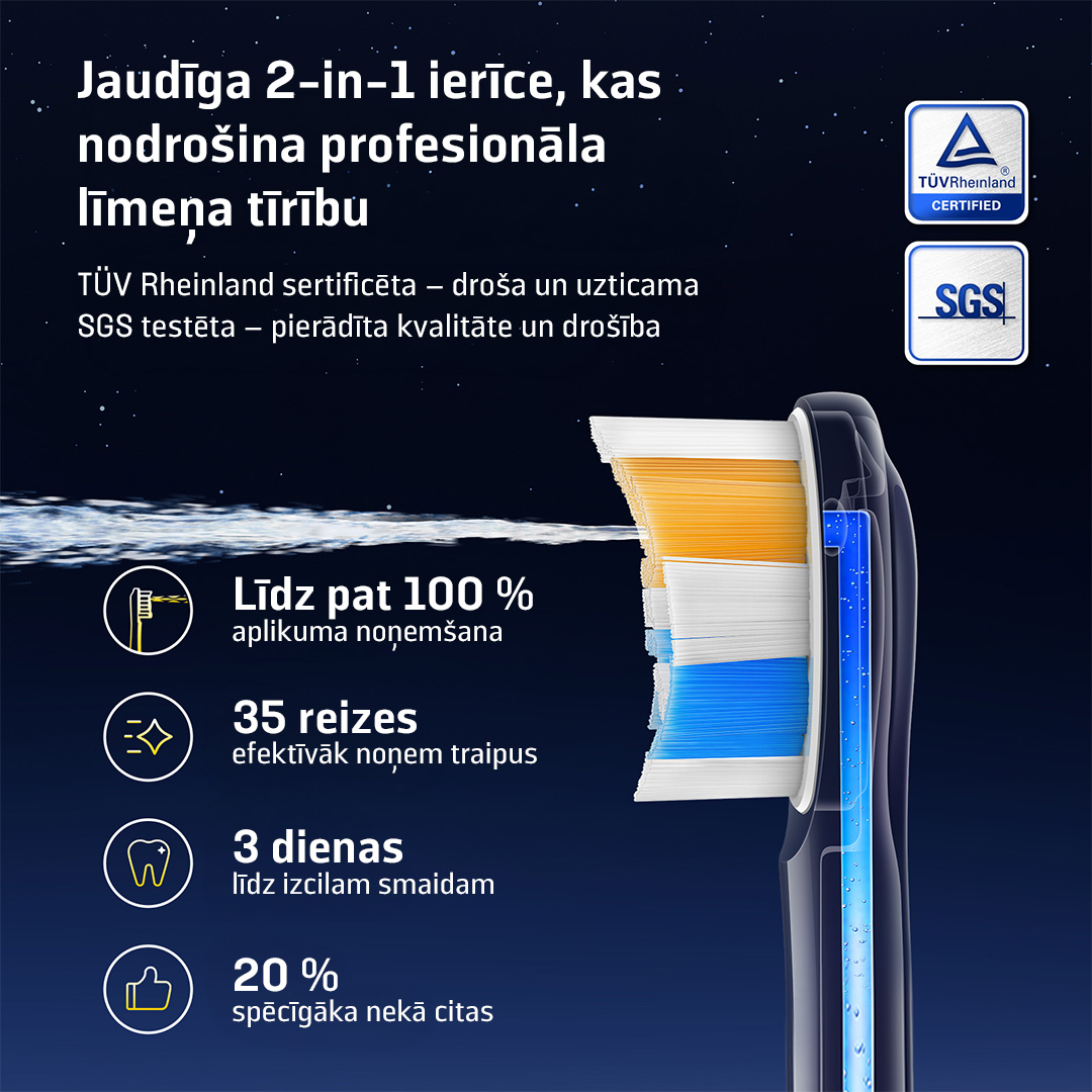 Apvieno sonisko zobu suku un ūdens floseri vienā ierīcē, samazinot kopšanas laiku uz pusi.