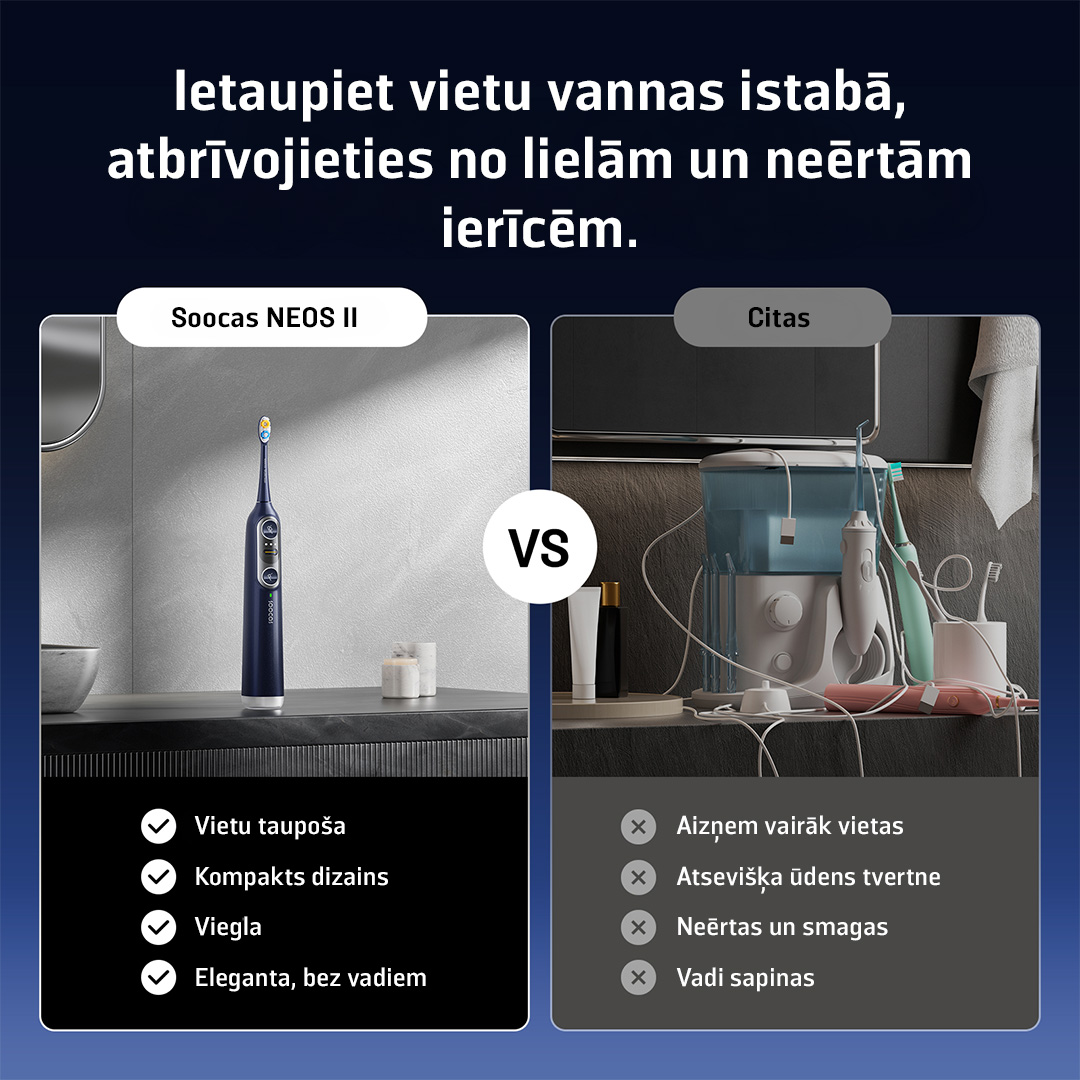 Tradicionālie mutes kopšanas produkti gadu desmitiem nav būtiski mainījušies. Lai gan iespējams izmantot zobu suku un ūdens floseri atsevišķi, divu ierīču lietošana bieži vien ir neērta. Soocas NEOS II apvieno abus vienā ierīcē, ļaujot viegli un efektīvi rūpēties par zobiem.
